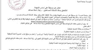 وزارة التعليم العالي و البحث العلمي جامعة المدية ads إعلان عن مسابقة على أساس الشهادة للإلتحاق بسلك الأساتذة المساعدين – رتبة: أستاذ مساعد تعلن جامعة المدية عن مسابقة على أساس الشهادة بعنوان سنة 2025 للإلتحاق بسلك الأساتذة المساعدين – رتبة: أستاذ مساعد وذلك وفقاً …