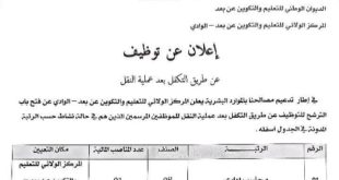 وزارة التربية الوطنية الديوان الوطني للتعليم والتكوين عن بعد المركز الولائي للتعليم والتكوين عن بعد – الوادي ads إعلان عن توظيف عن طريق التكفل بعد عملية النقل في إطار تدعيم مصالحنا بالموارد البشرية يعلن المركز الولائي للتعليم والتكوين عن بعد – الوادي عن فتح …
