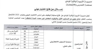 وزارة التربية الوطنية مديرية التربية لولاية الوادي مصلحة التمدرس والامتحانات ads إعلان عن فتح اختبار مهني تعلن مديرية التربية لولاية الوادي عن فتح مسابقة توظيف على أساس الاختبار المهني بعنوان: 2025 للالتحاق بمنصب شغل عمال مهنيين حسب الجدول التالي: سوناطراك تفتح باب التوظيف… مسابقات …
