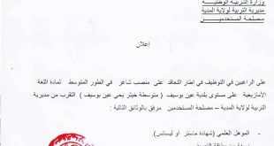وزارة التربية الوطنية مديرية التربية لولاية المدية مصلحة المستخدمين ads إعلان على الراغبين في التوظيف في إطار التعاقد على منصب شاغر في الطور المتوسط لمادة اللغة الأمازيغية على مستوى بلدية عين بوسيف ( متوسطة خنبر يحي عين بوسيف ) التقرب من مديرية التربية لولاية …