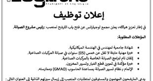 Groupe Legitrans Transport et Logistique ads إعلان توظيف في إطار تعزيز هياكله، يعلن مجمع لوجيترانس عن فتح باب الترشح لمنصب: رئيس مشروع الصيانة. المؤهلات المطلوبة: شهادة جامعية لمهندس في الهندسة الميكانيكية. خبرة مهنية مثبتة لا تقل عن خمس (05) سنوات في صيانة المركبات الصناعية. …