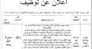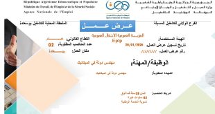 وزارة العمل والتشغيل والضمان الاجتماعي الوكالة الوطنية للتشغيل الفرع الولائي للتشغيل المسيلة الملحقة المحلية للتشغيل بوسعادة ads عـــرض عـمـل الهيئة المستخدمة: المؤسسة العمومية للأشغال العمومية EPTP القطاع القانوني: عـام تاريخ تسجيل عرض العمل: 20/01/2026 مكان العمل: بوسعادة 1.المهنة: مهندس دولة في الميكانيك عدد المناصب …