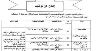 مديرية الصحة والسكان لولاية سكيكدة المؤسسة الاستشفائية عبد الرزاق بوحارة سكيكدة ads إعلان عن توظيف يعلن السيد المدير العام للمؤسسة الاستشفائية عبد الرزاق بوحارة سكيكدة عن فتح مسابقة توظيف في الرتب التالية: طبيب عام في الصحة العمومية صيدلاني في الصحة العمومية درجة اولى مساعد …