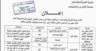 وزارة التربية الوطنية مديرية التربية لولاية بشار مصلحة التمدرس والامتحانات ads إعـلان عن توظيف تعلن مديرية التربية لولاية بشار عن فتح مسابقة على أساس الاختبار المهني للرتبة المبينة أدناه: عامل مهني من المستوى الثاني والثالث غير محدد المدة بالتوقيت (الكامل متعاقد) الرتبةالبلديات المعنيةالتخصصعدد المناصبالمؤهلاتعامل …