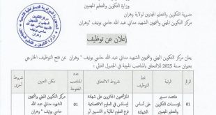 وزارة العمل والتشغيل والضمان الاجتماعي الوكالة الوطنية للتشغيل ads عرض عمل بالتبادل إسم المؤسسة: المؤسسة الوطنية للأشغال البترولية الكبرى (ENGTP) مكان العمل: ولاية تيميمون المهنة المطلوبةالشهادةالعددالشروط المطلوبةRadiométallographeRadiométallographe04– خبرة مهنية في المجال من 03 إلى 05 سنوات– إتقان أساسيات التلحيم– تسوية الخدمة الوطنيةContrôleur de soudur …