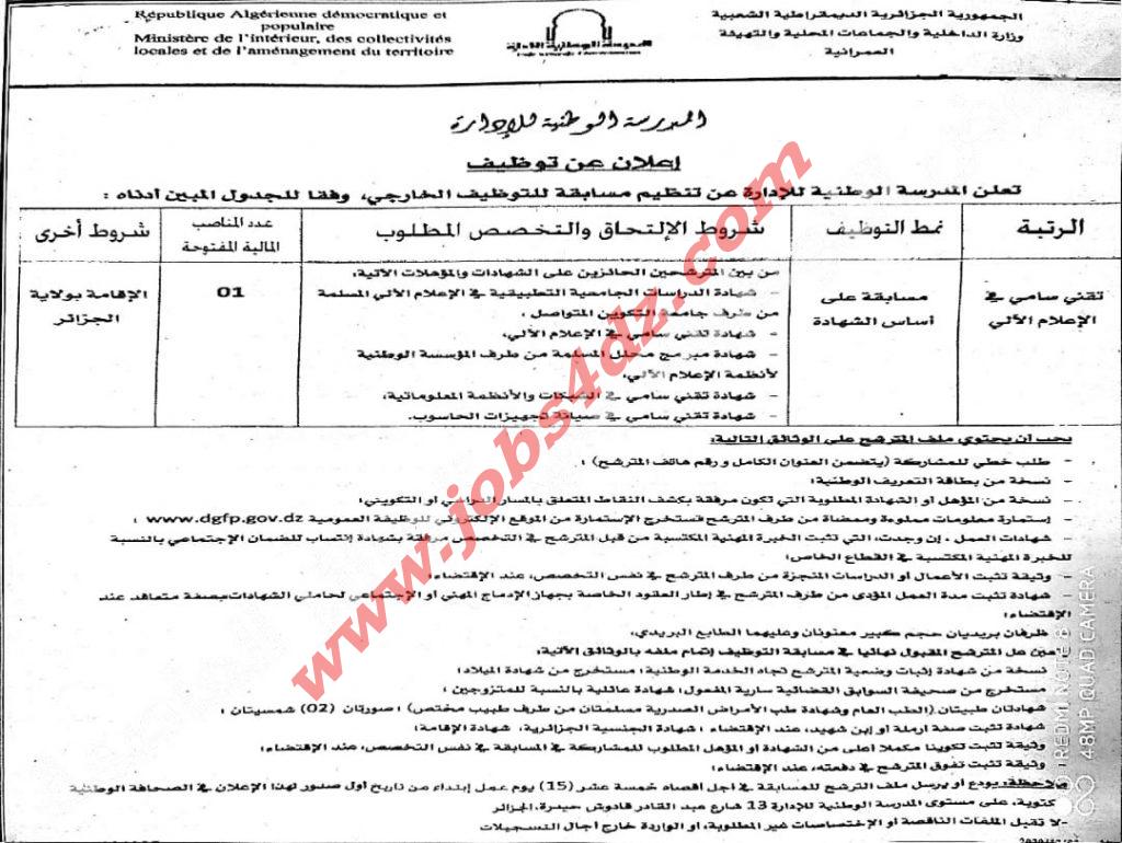 تعلن المدرسة الوطنية للادارة عن تنظيم مسابقة للتوظيف الخارجي على أساس الشهادة في الرتب التالية