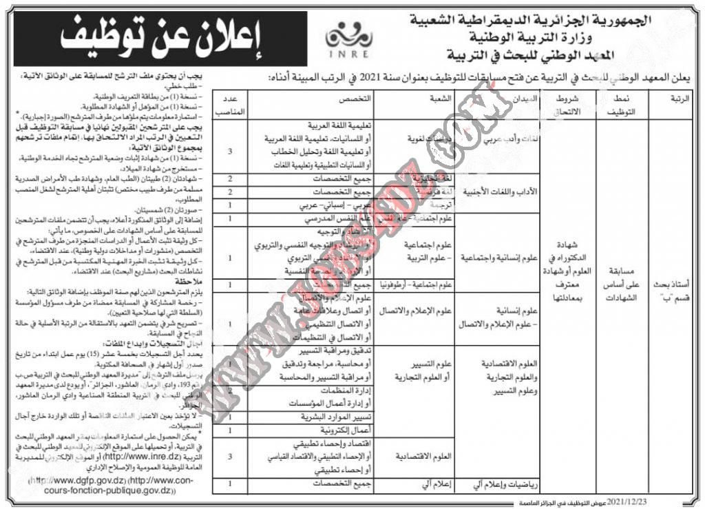 يعلن المعهد الوطني للبحث في التربية بواد الرمان العاشور بالجزائر العاصمة عن فتح مسابقة توظيف على اساس الشهادات في المناصب التالية