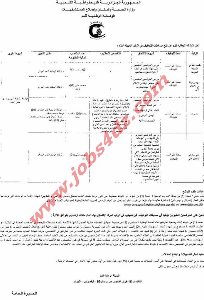 إعلان عن توظيف على أساس الشهادة بالوكالة الوطنية للدم بتيقصرايين بالجزائر العاصمة