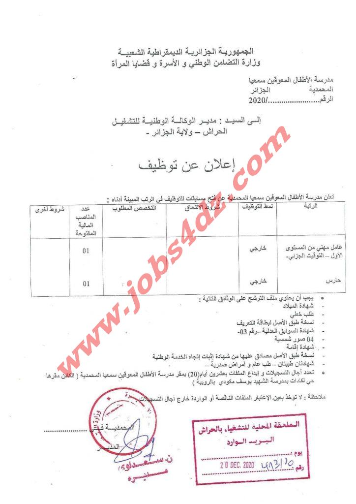 مدرسة الأطفال المعوقين سمعيا المحمدية و الكائن مقرها بحي لكادات بمدرسة الشهيد يوسف مكودي بالرويبة، الجزائر العاصمة تعلن عن فتح توظيف في المناصب التالية