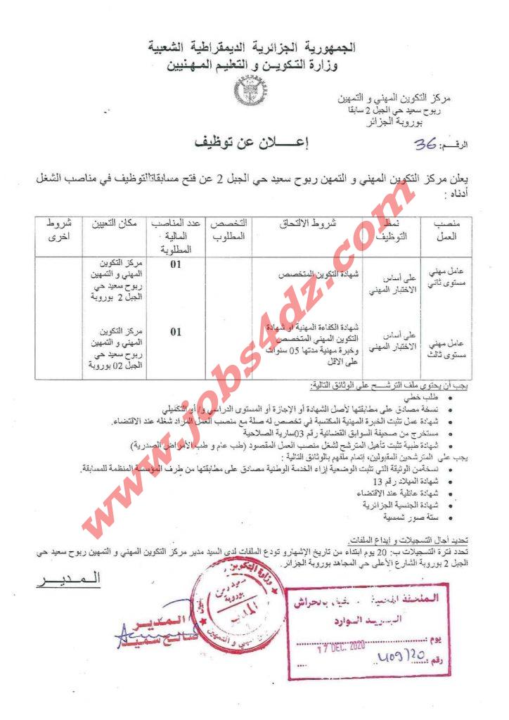يعلن مركز التكوين المهني والتمهين ربوح سعيد حي الجبل 2 عن فتح مسابقة للتوظيف في الرتب المبينة ادناه