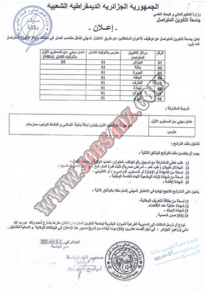 إعلان عن توظيف على أساس الإختبار المهني لأعوان متعاقدين لشغل مناصب عمل في مختلف مراكز التكوين المتواصل كما يلي :