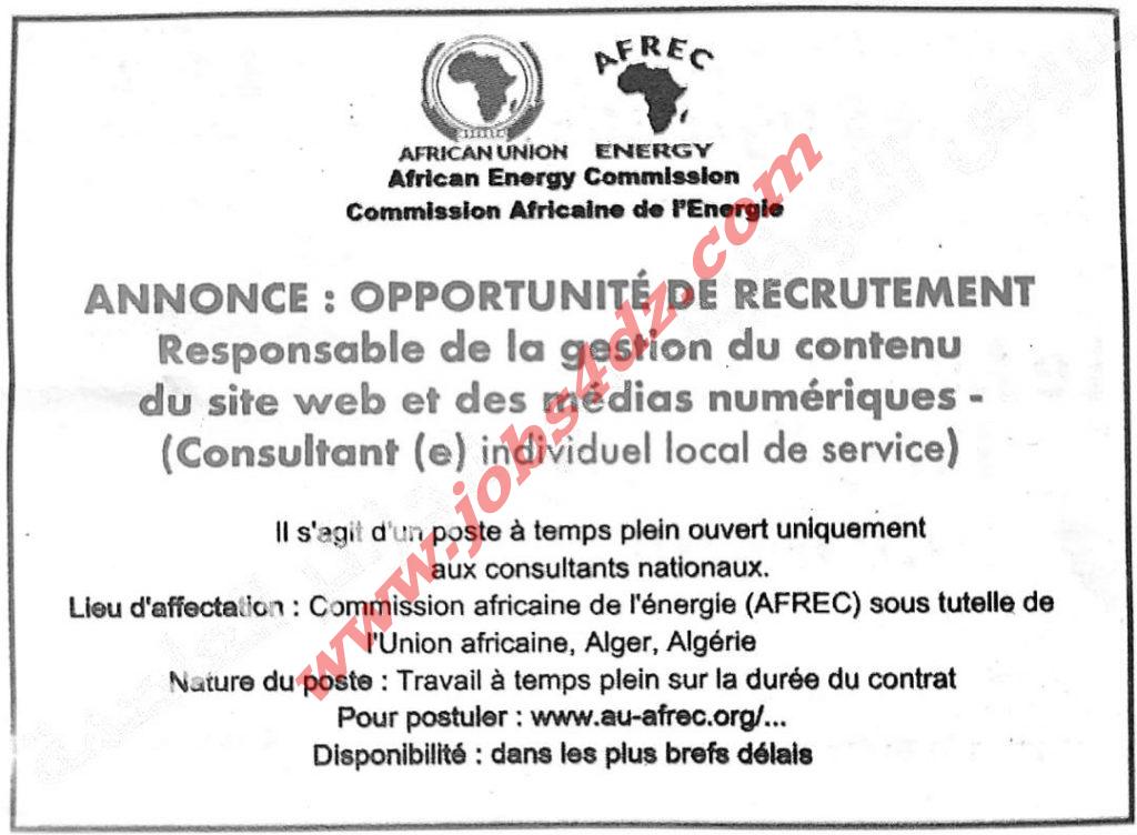 إعلان عن توظيف باللجنة الإفريقية للطاقة التي هي تحت إشراف الإتحاد الإفريقي بالجزائر العاصمة :