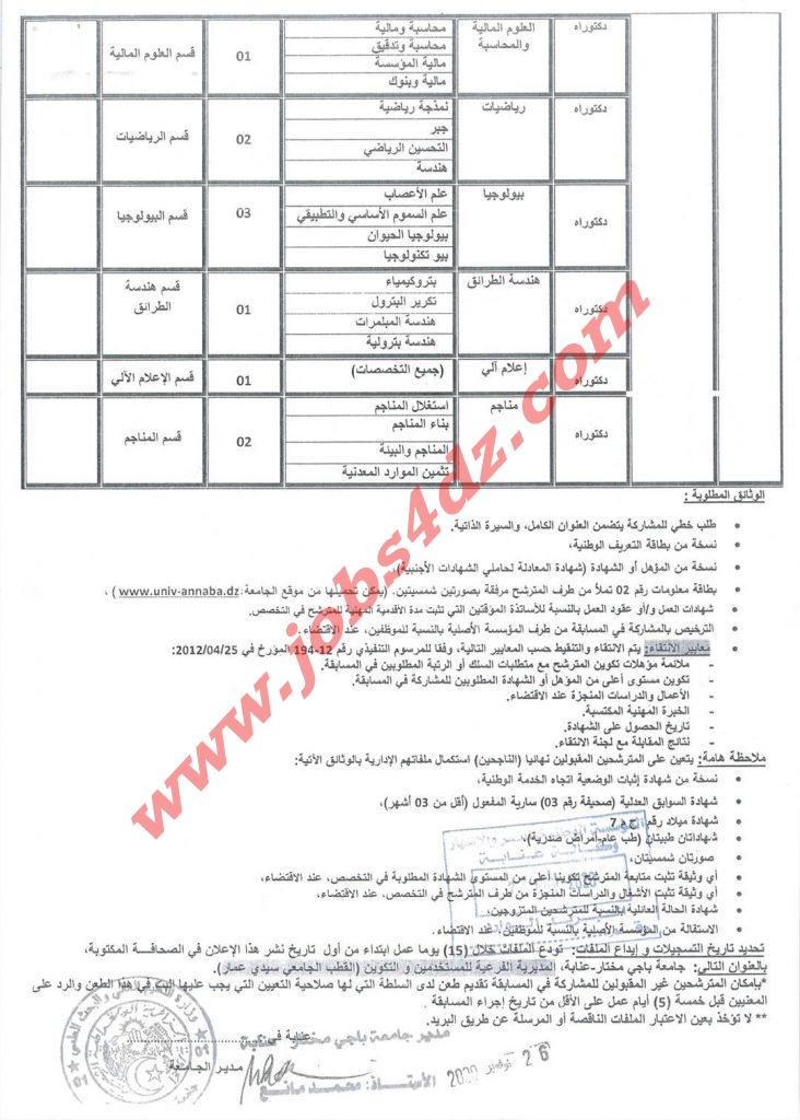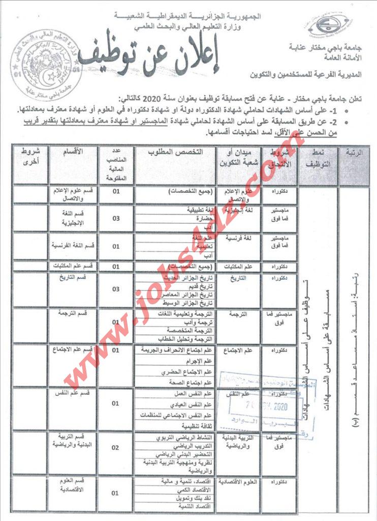 تعلن جامعة باجي مختار عنابة عن فتح مسابقة توظيف بعنوان سنة 2020 كالتالي للالتحاق برتبة