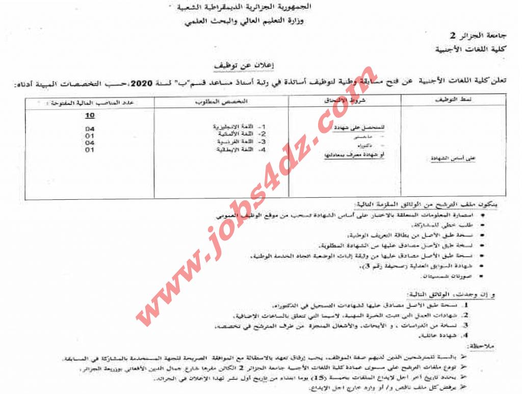 تعلن كلية اللغات الاجنبية عن فتح مسابقة وطنية لتوظيف اساتذة على أساس الشهادة في رتبة استاذ مساعد قسم ب لسنة 2020 التحصصات في الصورة اسفله