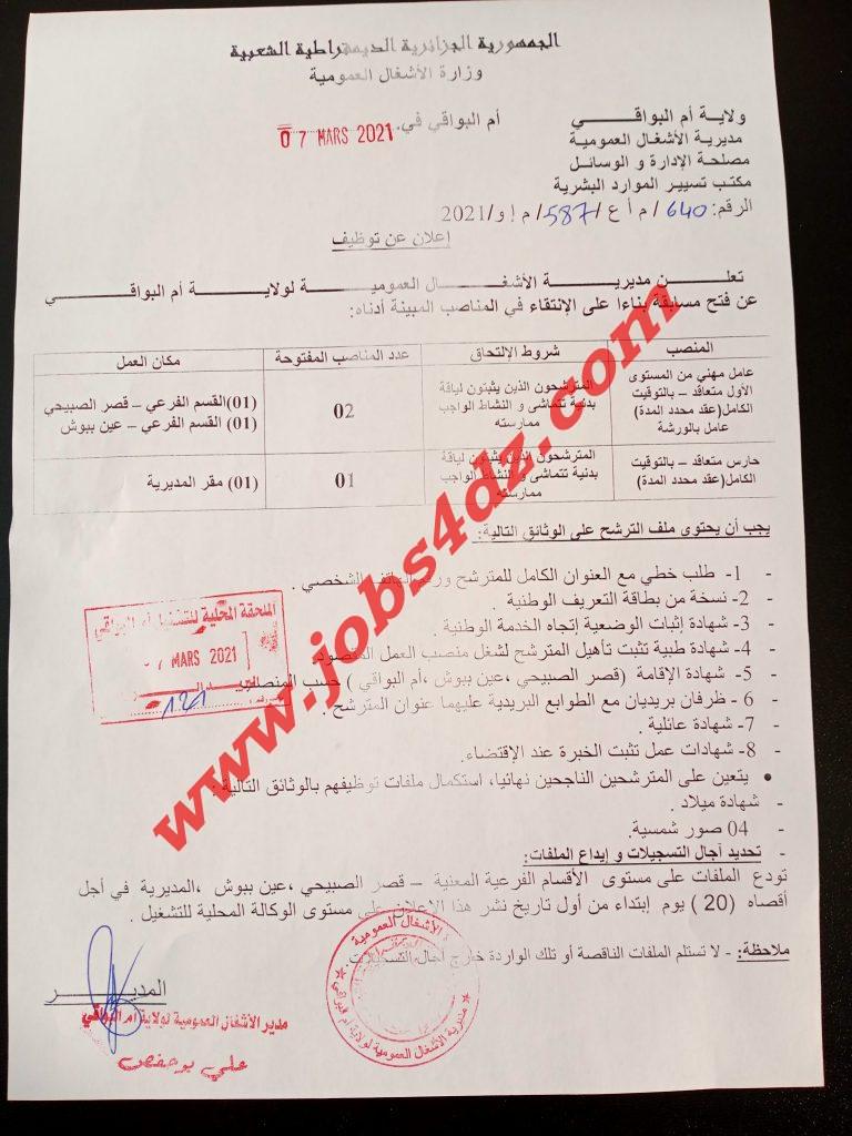 إعلان عن توظيف بمديرة الأشغال العمومية أم البواقي.