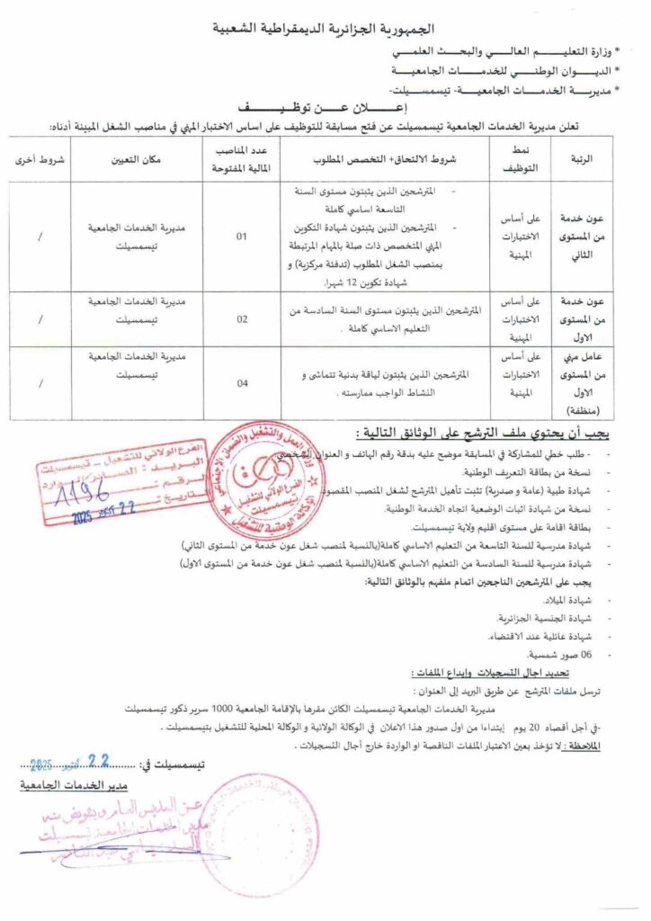 تعلن مديرية الخدمات الجامعية تيسمسيلت عن فتح مسابقة للتوظيف على أساس الاختبار المهني في مناصب الشغل المبينة أدناه: