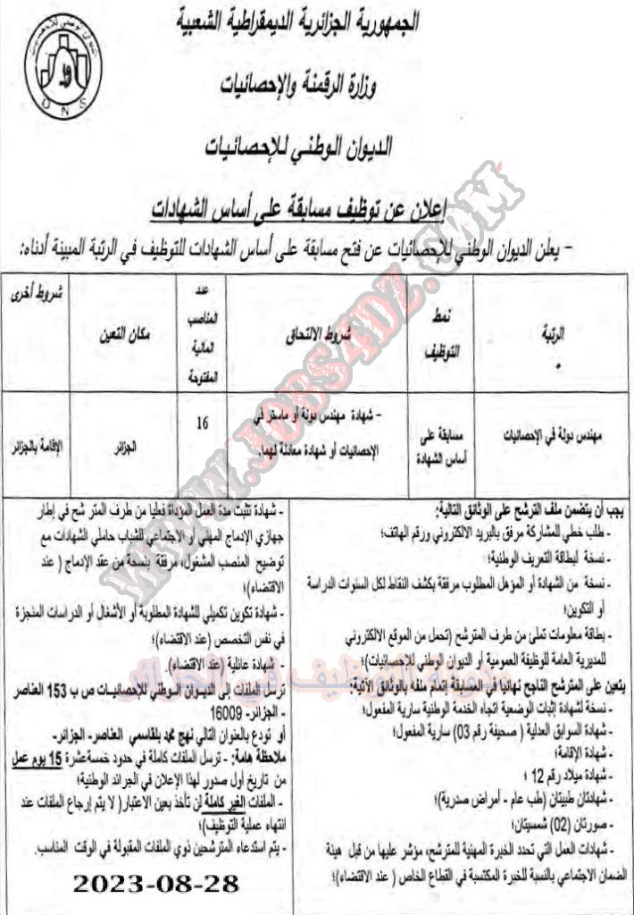 تعلن الديوان الوطني للاحصائيات عن فتح مسابقة توظيف على اساس الشهادة في الرتب المبينة ادناه