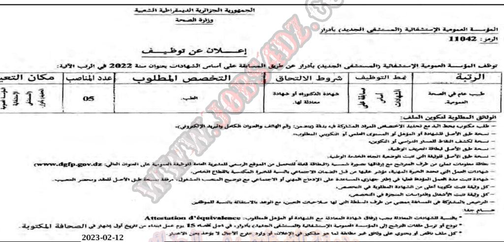 تعلن المؤسسة العمومية الاستشقائية بادرار عن فتح مسابقة توظيف على اساس الشهادة في الرتب المبينة ادناه