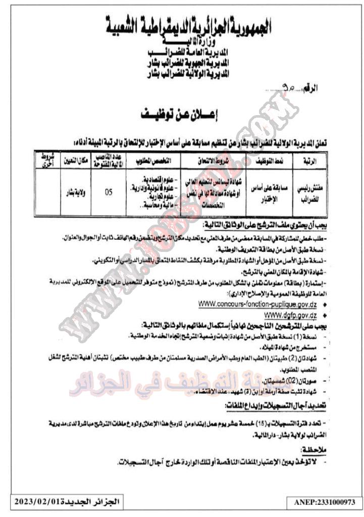 تعلن المديرية الولائية للضرائب بشار عن فتح مسابقة توظيف على اساس الاختبار في الرتب المبينة ادناه