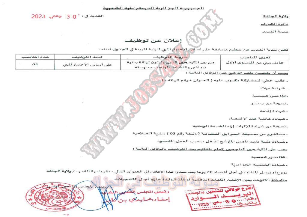 تعلن بلدية القديد ولاية الجلفة عن فتح مسابقة توظيف على اساس الاختبار المهني في الرتب المبينة ادناه