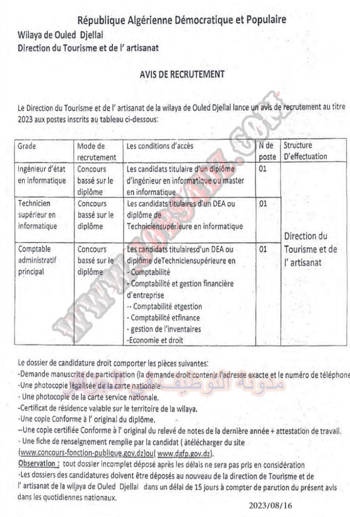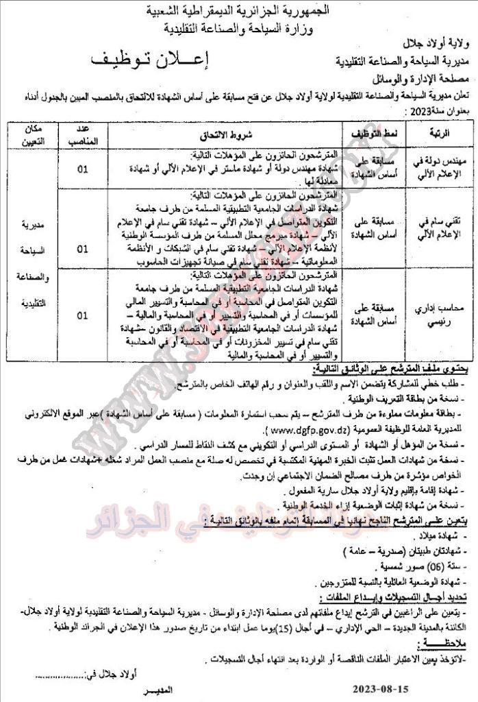 تعلن مديرية السياحة والصناعة التقليدية لولاية اولاد جلال عن فتح مسابقة توظيف في الرتب المبينة ادناه