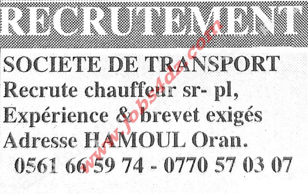 شركة نقل متواجدة بالحامول بولاية وهران توظف :
