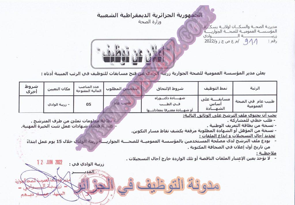 تعلن المؤسسة العمومية للصحة الجوارية زريبة الوادي عن فتح مسابقة توظيف على اساس الشهادة بعنوان السنة المالية 2022 في المناصب المبينة ادناه