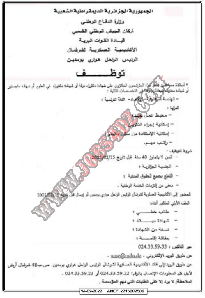 تعلن الاكاديمية العسكرية لشرشال الرئيس الراحل هواري بومدين عن توظيف في المناصب التالية