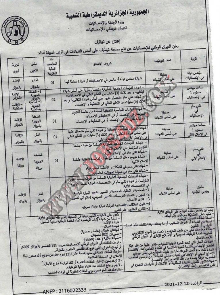 يعلن الديوان الوطني للاحصائيات عن فتح مسابقة للتوظيف على اساس الشهادات في الرتب المبينة ادناه