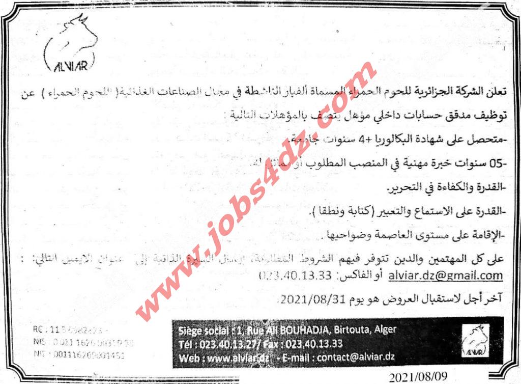 تعلن الشركة الجزائرية للحوم الحمراء المسماة ALVIAR الكائن مقرها ببئر توتة بالجزائر العاصمة عن توظيف كما هو موضح ادناه