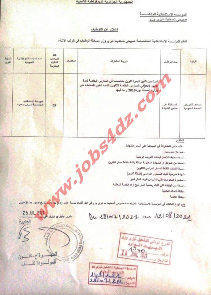 تعلن المؤسسة الاستشفائية المتخصصة صبيحي تسعديت ولاية تيزي وزو عن فتح مسابقة توظيف في الرتب المبينة ادناه :