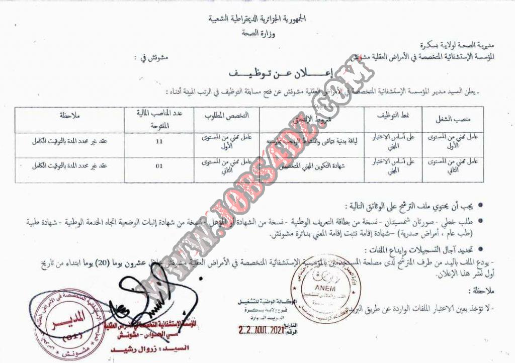 يعلن مدير المؤسسة الاستشفائية المتخصصة في الامراض العقلية مشونش عن فتح مسابقة للتوظيف في الرتب التالية