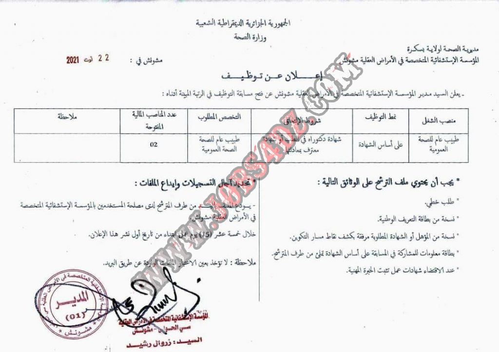 اخر اجل لايداع الملفات 15 يوم من تاريخ الاعلان بالنسبة لمنصب طبيب عام و 20 يوم بالنسبة لمناصب عمال مهنيين
