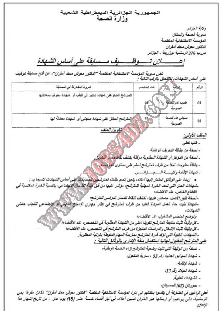 تعلن مديرية المؤسسة الاستشفائية المختصة الدكتور معوش محند امقران ببوزريعة الجزائر العاصمة عن فتح مسابقة توظيف على اساس الشهادات في الرتبة المبينة ادناه