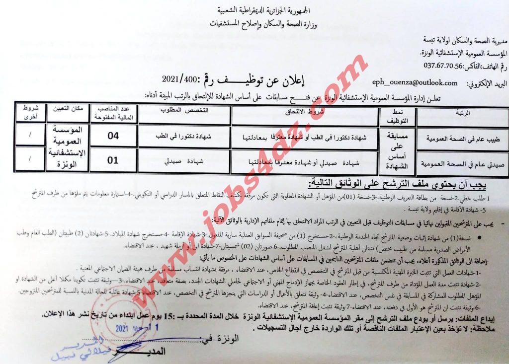 تعلن ادارة المؤسسة العمومية الإستشفائية الونزة عن فتح مسابقة توظيف على أساس الشهادة للالتحاق بالرتب التالية :