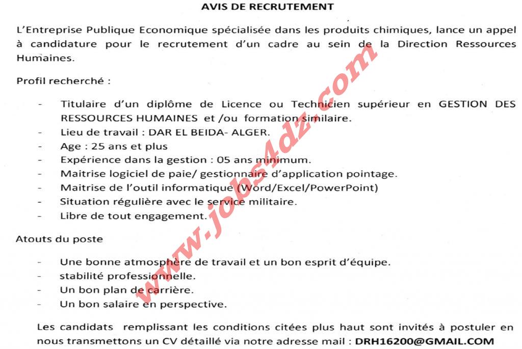 المؤسسة العمومية الإقتصادية المتخصصة في المواد الكيميائية بالجزائر العاصمة توظف