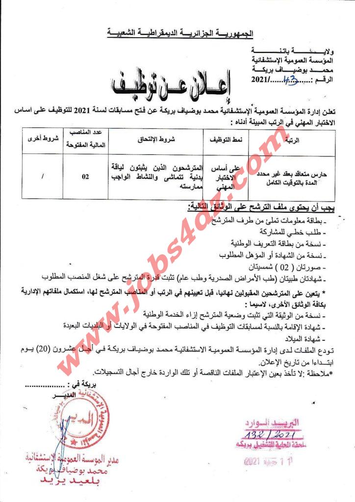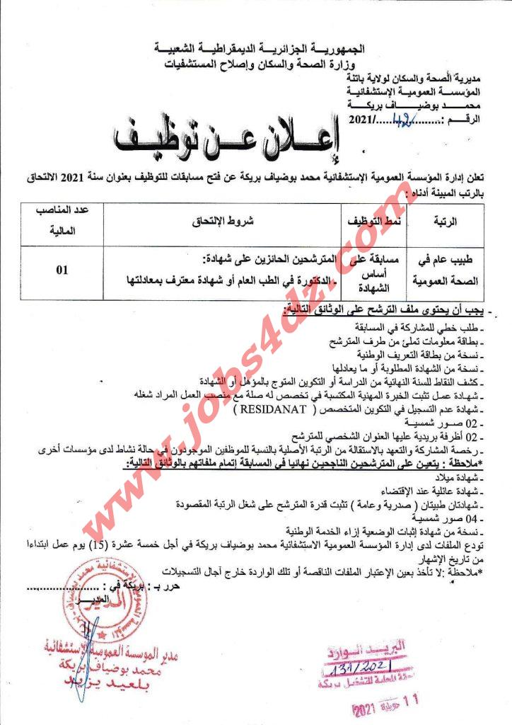 تعلن ادارة المؤسسة العمومية الاستشفائية محمد بوضياف بريكة عن فتح مسابقات للتوظيف بعنوان سنة 2021 للالتحاق بالرتب التالية