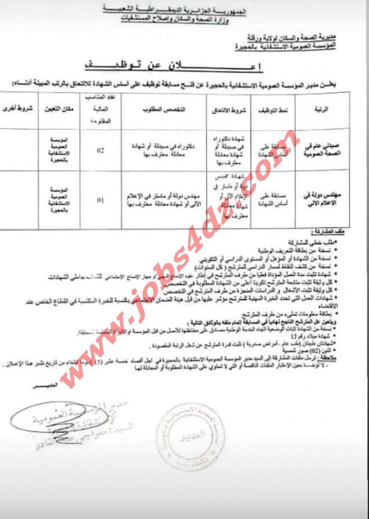 يعلن مدير المؤسسة العمومية الاستشفائية بالحجيرة عن فتح مسابقة توظيف على اساس الشهادة للالتحاق بالرتب التالية