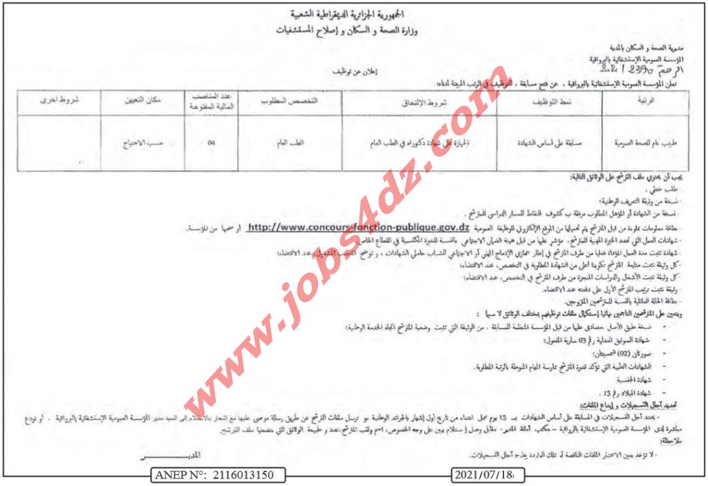 تعلن المؤسسة العمومية الاستشفائية بالبرواقية عن فتح مسابقة للتوظيف في الرتب المبينة ادناه