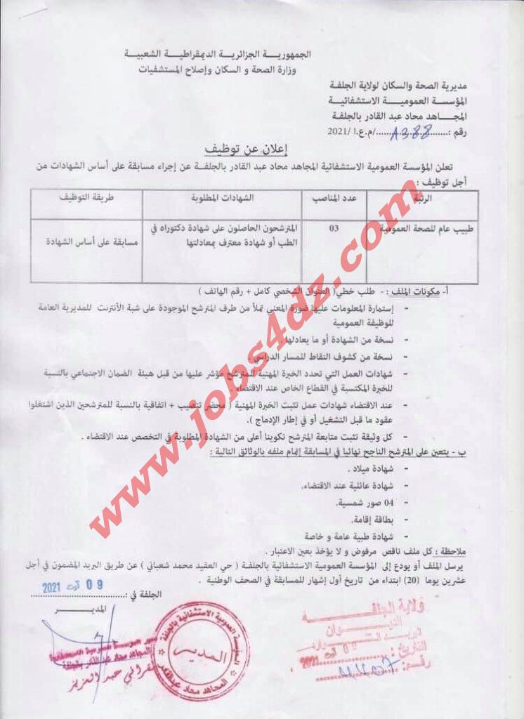 تعلن المؤسسة العمومية الاستشفائية المجاهد محاد عبد القادر بالجلفة عن اجراء مسابقة على اساس الشهادة من اجل التوظيف في المناصب التالية