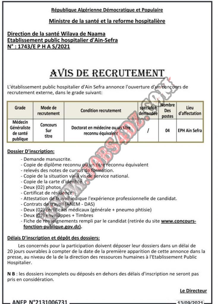 تعلن المؤسسة العمومية الاستشفائية بالعين الصفراء ولاية النعامة عن فتح مسابقة توظيف في المناصب التالية