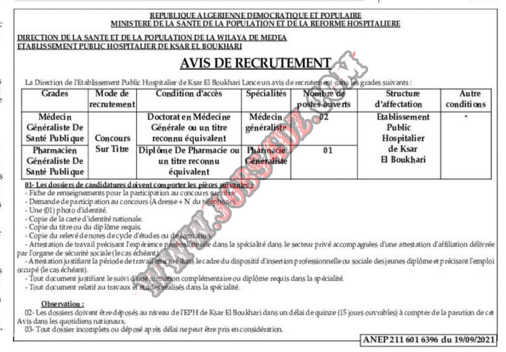 تعلن إدارة المؤسسة العمومية الاستشفائية قصر البخاري ولاية المدية عن فتح مسابقة توظيف في المناصب التالية