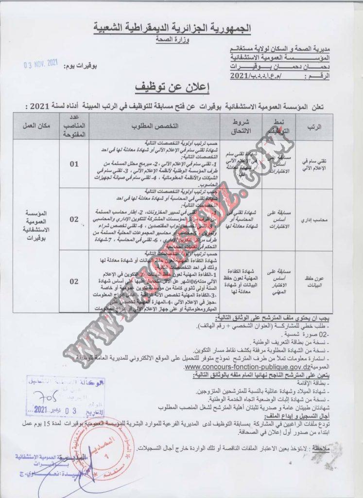 اعلان توظيف بالمؤسسة العمومية الاستشفائية بوقيرات مستغانم
