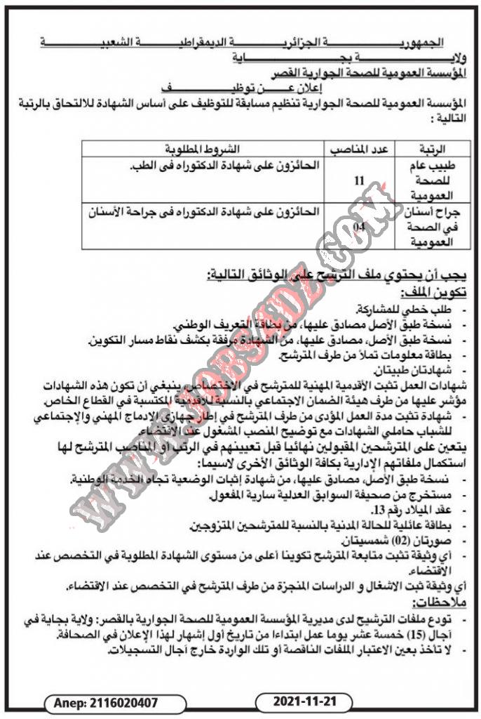 تعلن المؤسسة العمومية للصحة الجوارية القصر بجاية عن فتح مسابقة للتوظيف في الرتب المبينة ادناه لسنة 2021