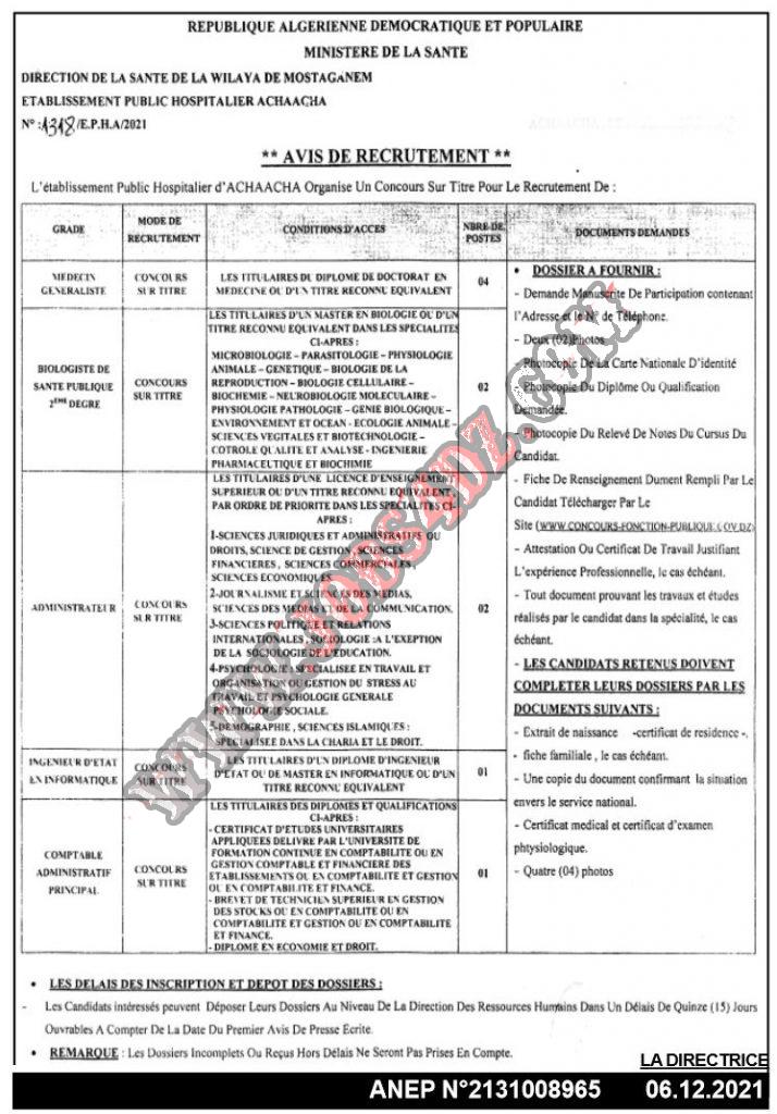 تعلن المؤسسة العمومية الاستشفائية عشعاشة بولاية مستغانم عن فتح توظيف على اساس الشهادة في المناصب المبينة ادناه