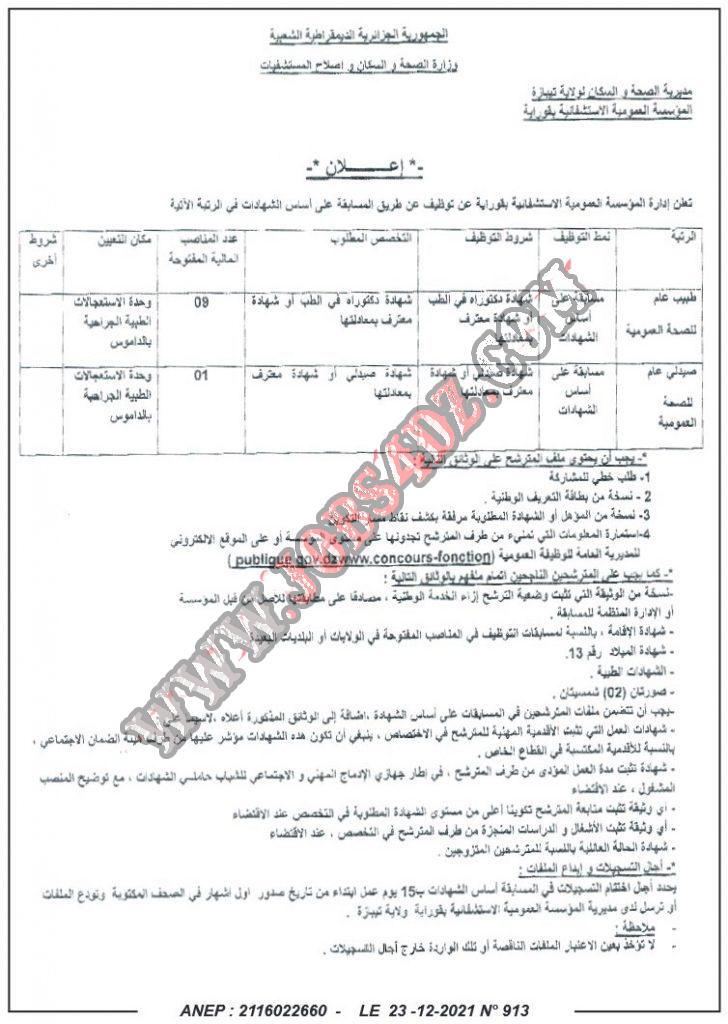 تعلن المؤسسة العمومية الاستشفائية قوراية ولاية تيبازة عن فتح مسابقة توظيف على اساس الشهادات في المناصب التالية