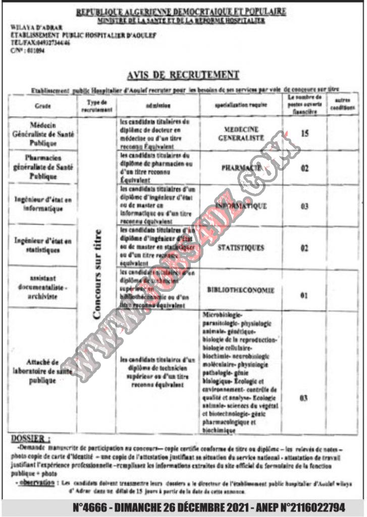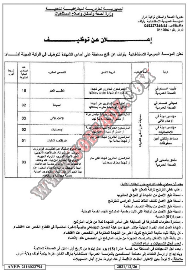تعلن المؤسسة العمومية الاستشفائية باولف ولاي ادرار عن فتح مسابقة توظيف على اساس الشهادات في المناصب التالية