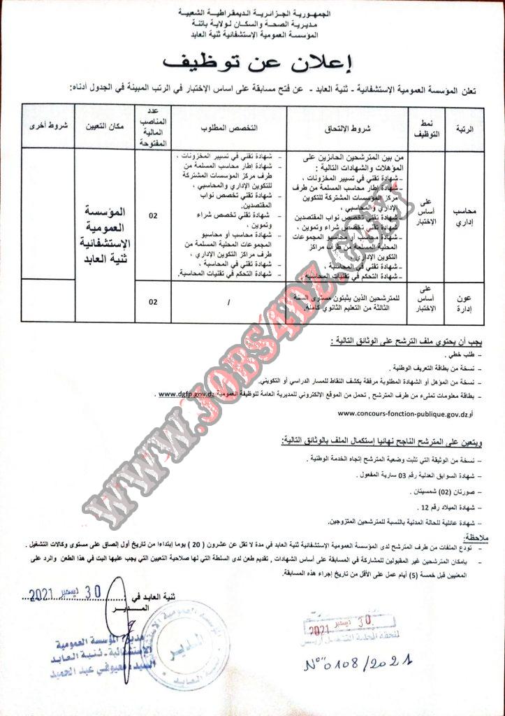 تعلن المؤسسة العمومية الاستشفائية ثنية الحد عن فتح مسابقة توظيف على اساس الشهادة في المناصب التالية