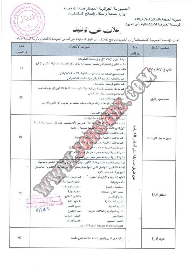 تعلن المؤسسة العمومية الاستشفائية راس العيون ولاية باتنة عن فتح مسابقة توظيف على اساس الشهادة في المناصب التالية