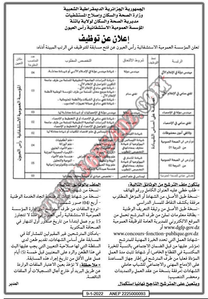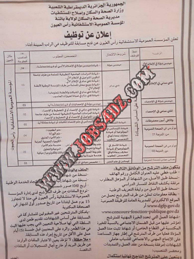 تعلن المؤسسة العمومية الاستشفائية راس العيون باتنة عن فتح مسابقة توظيف على اساس الشهادة في المناصب التالية
